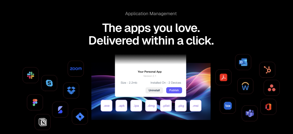 A UEM solution that lets you publish apps when and how you need them—silently, securely, and without disruptions. Choose apps from Play Store, App Store, PWAs or enterprise app store. Publish an App Catalog with all the necessary apps with ease. The power of choice, effortlessly delivered.